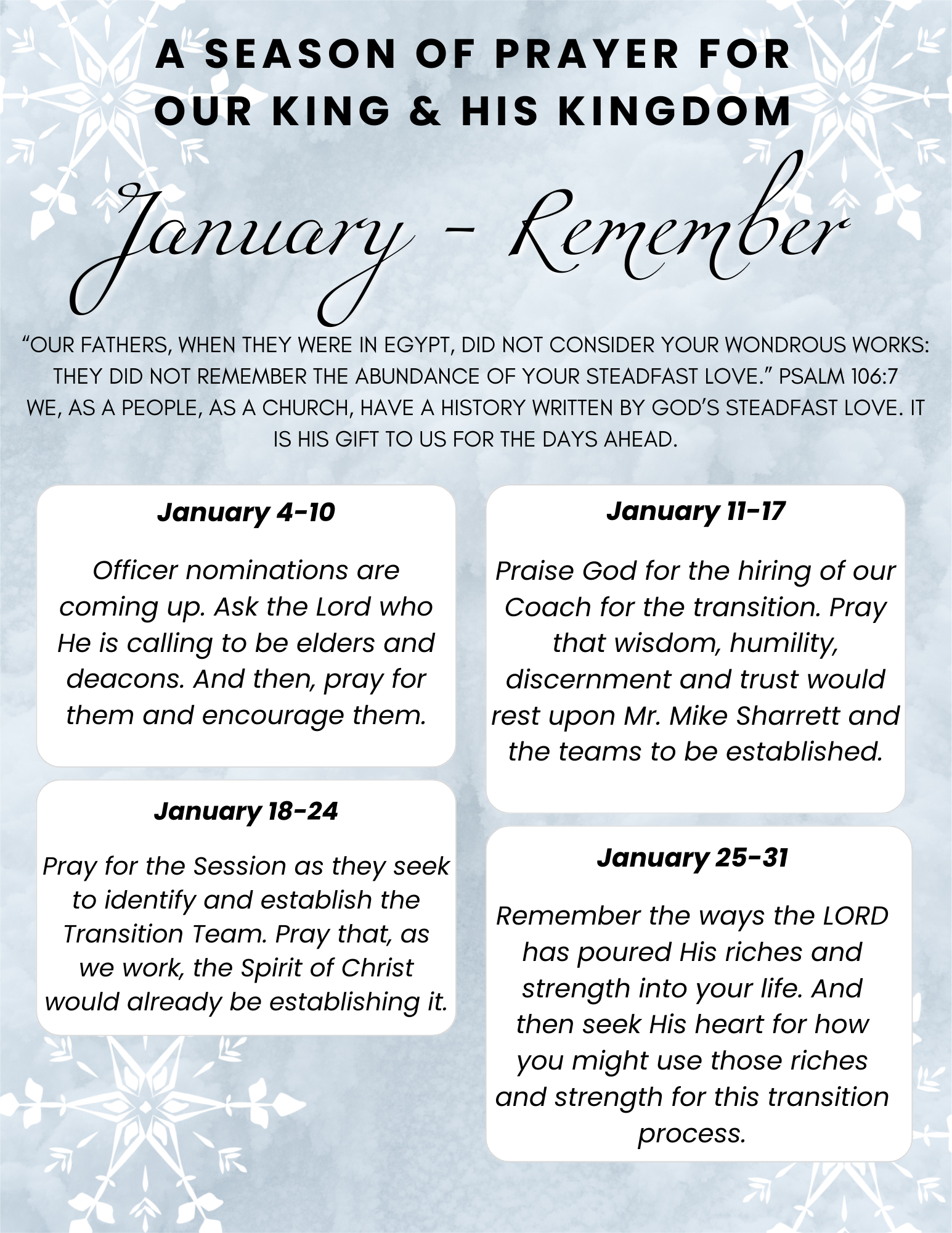 November 2025 - We enter a season of prayer for our pastoral transition. The current month's prayer theme will be posted on this page; the congregation is encouraged to share their own prayers in Realm (our internal communications forum).